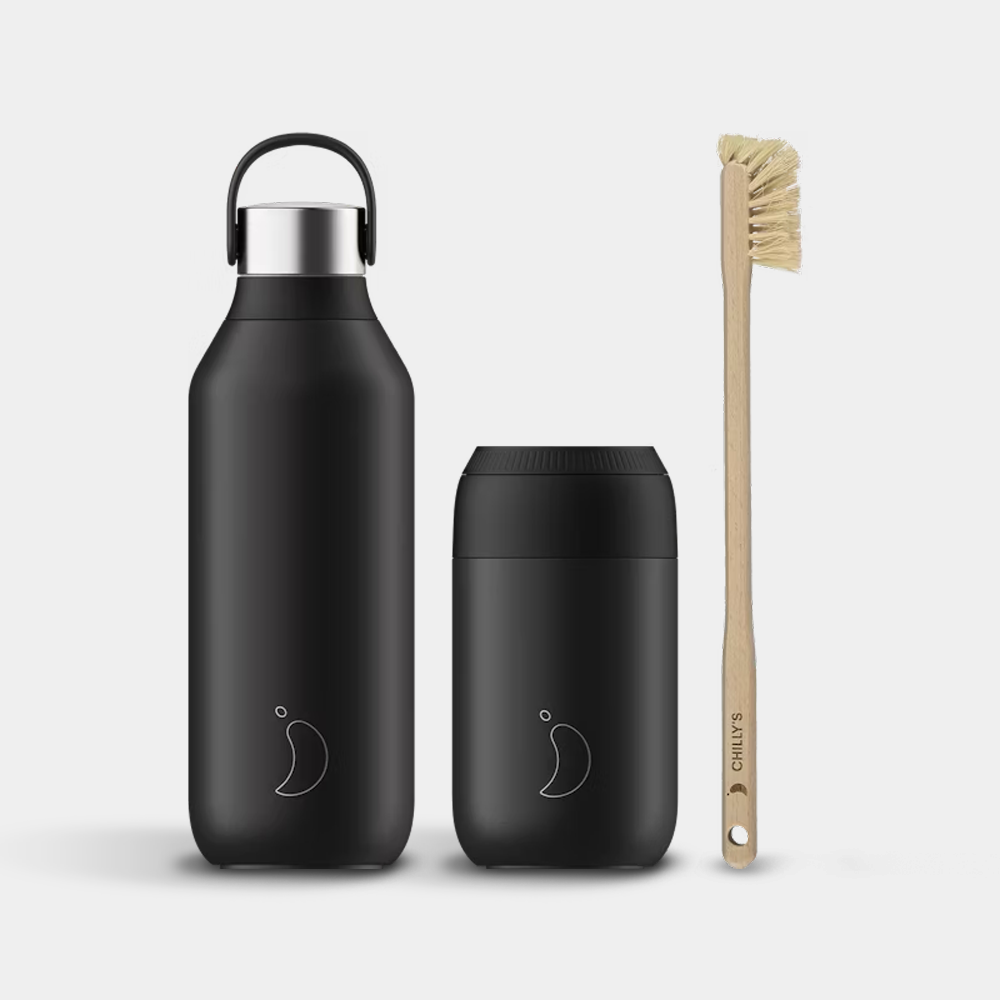 Your bundle includes a Series 2 500ml bottle, a Series 2 340ml coffee cup, and an all-natural beechwood Chilly’s brush.